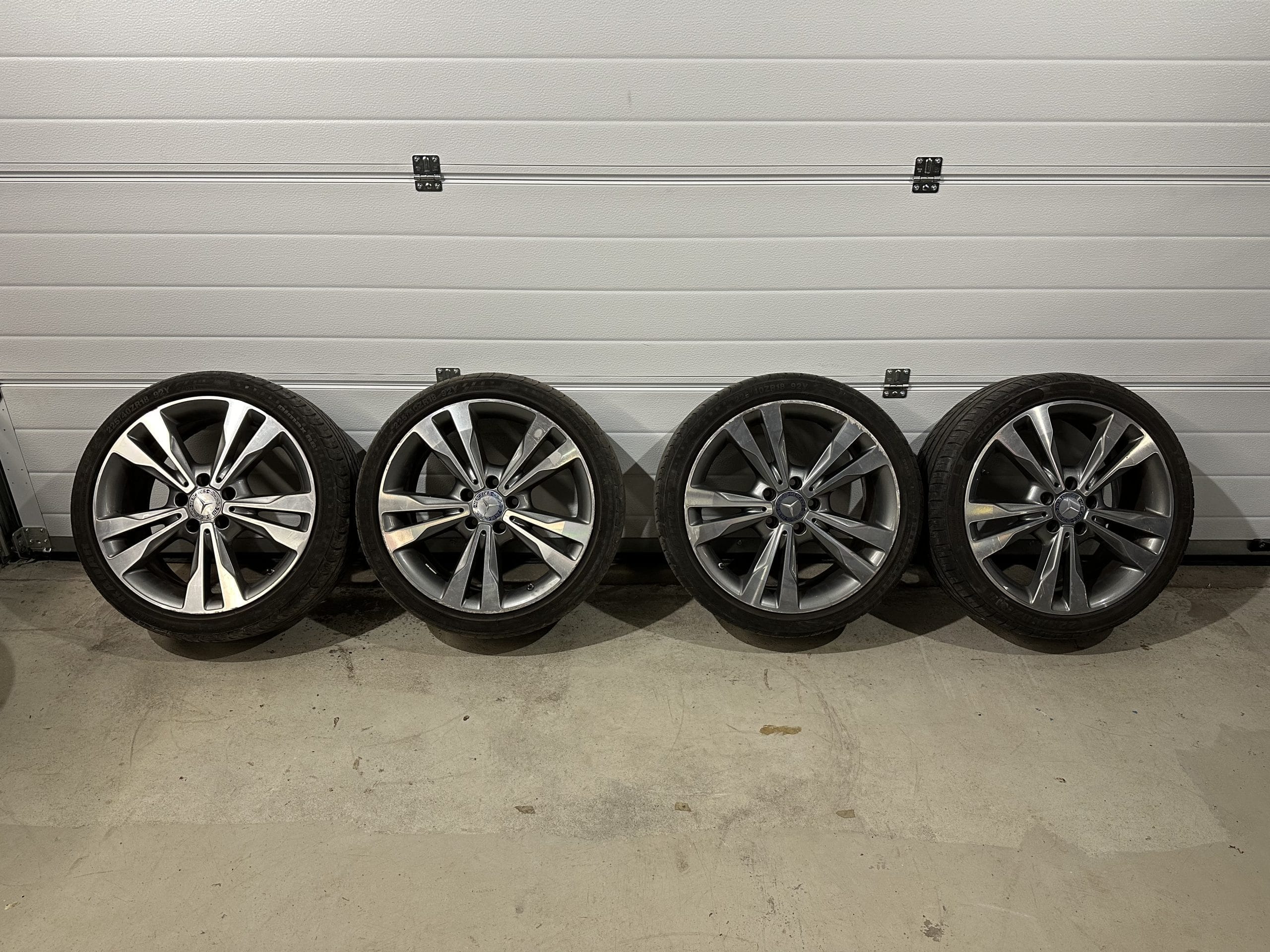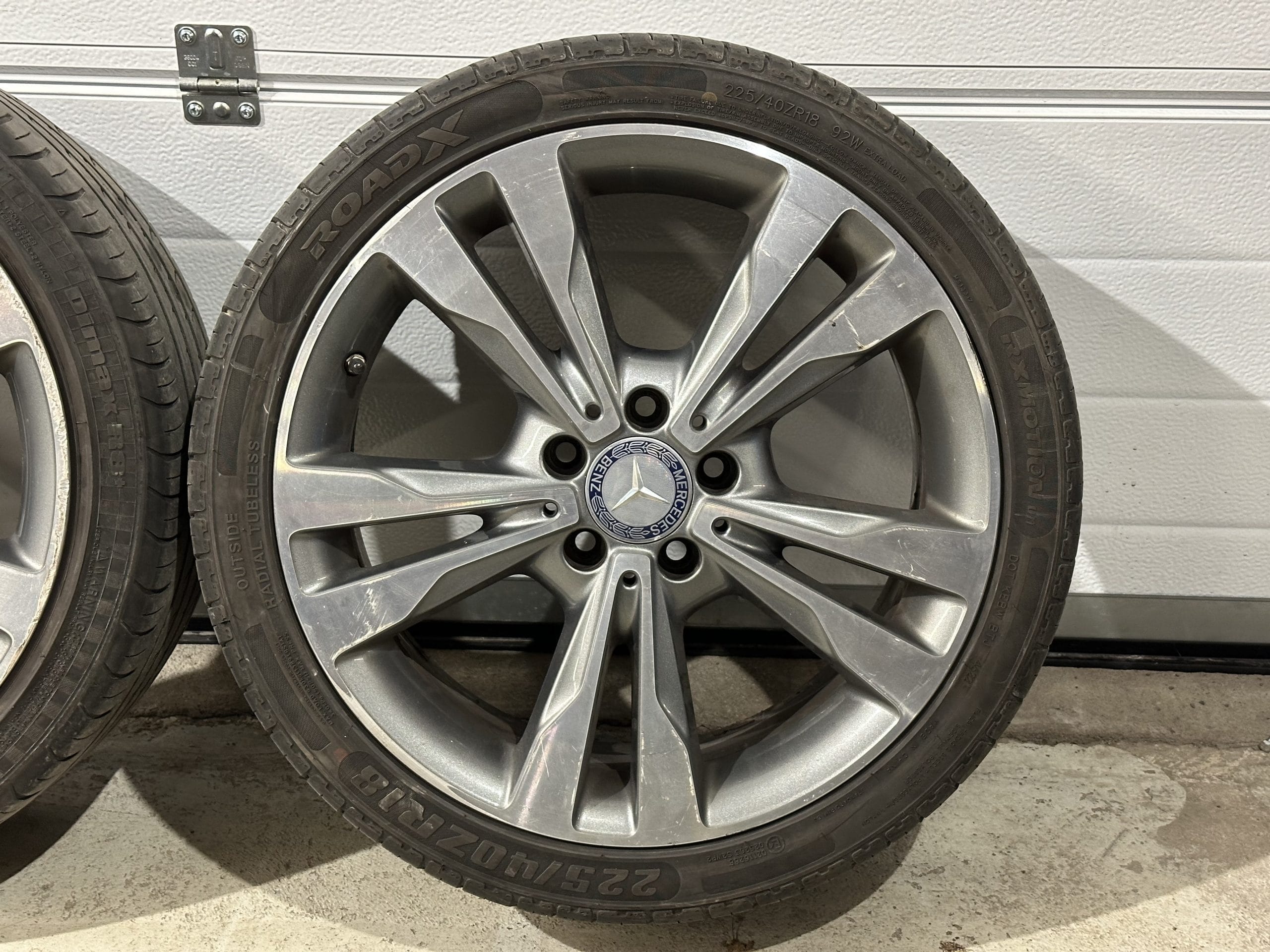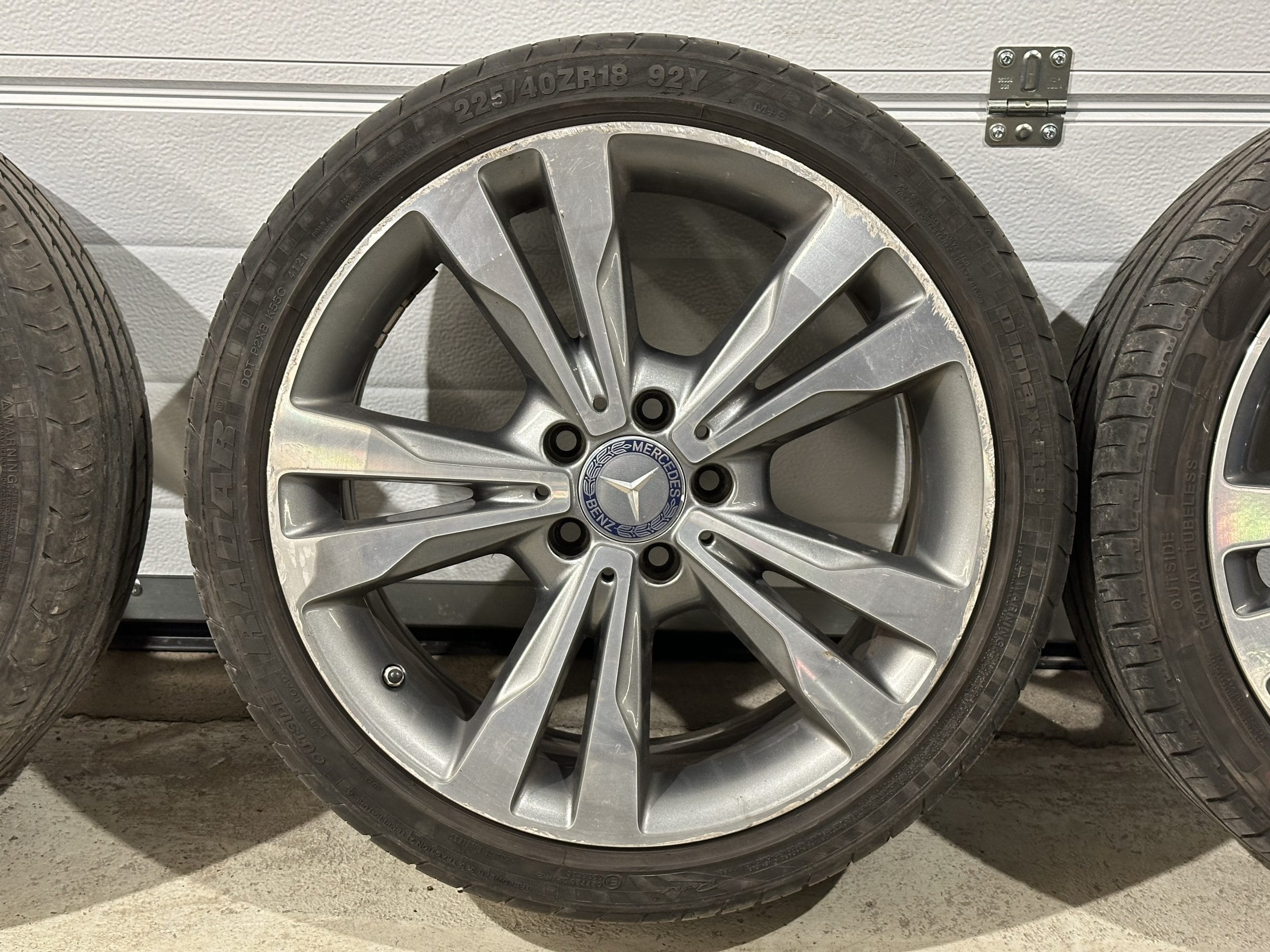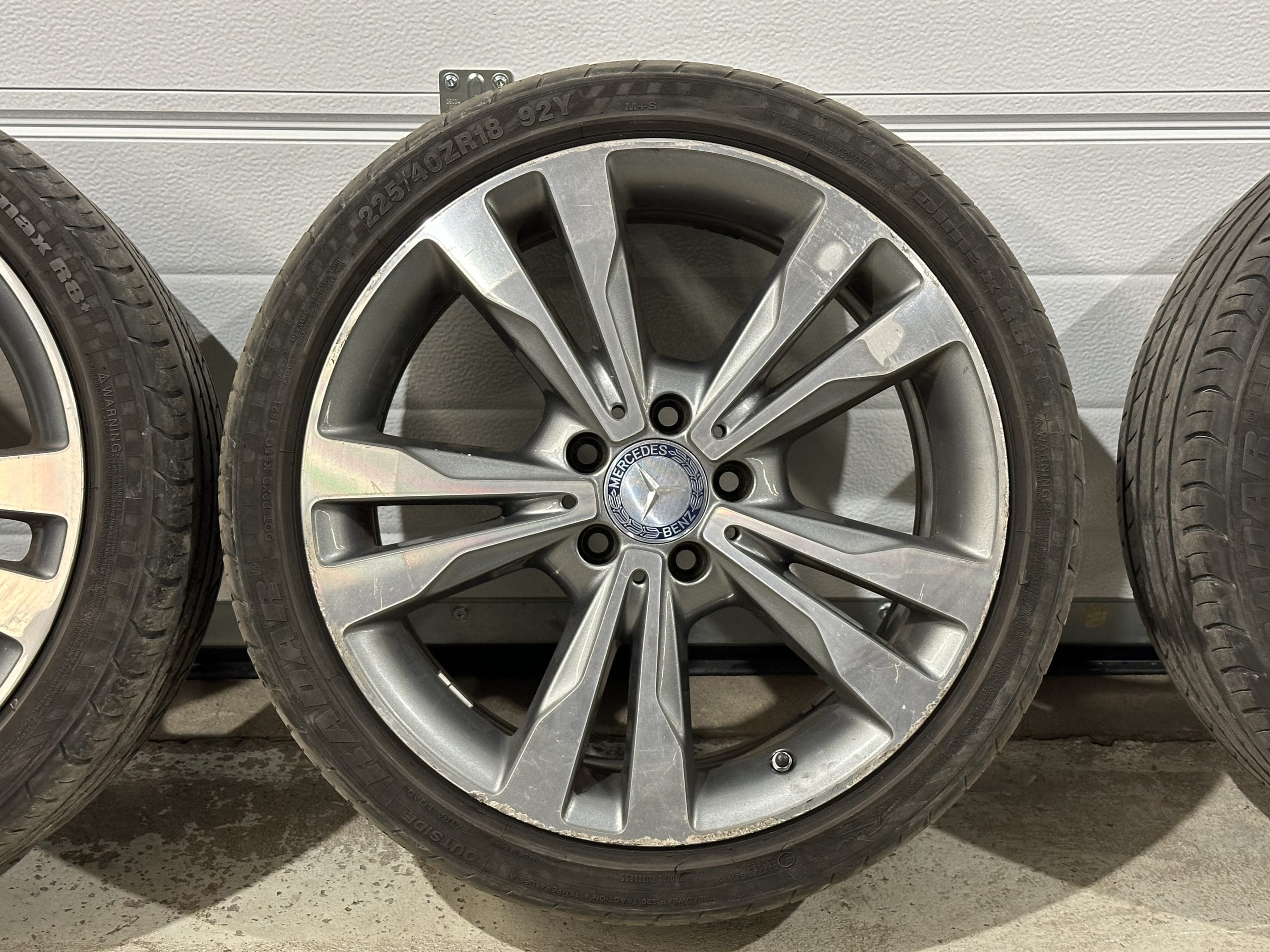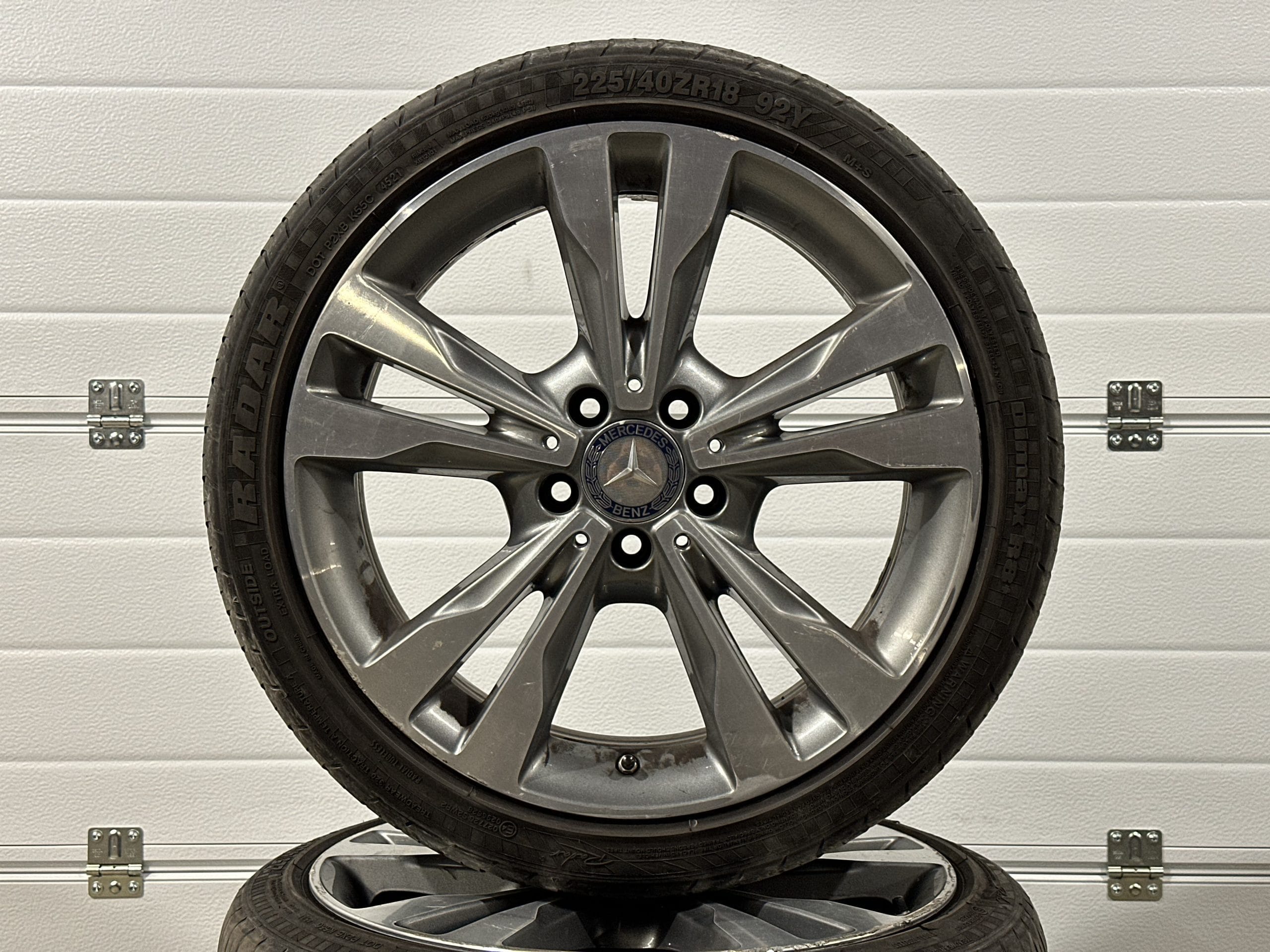 Alkuperäiset alumiinivanteet Mercedes C-sarjaan (W205). Renkaina Radar 225/40-18 (92) kesärenkaat, joissa pintaa n. 4,0: 3,7; 2,8 ja 5,2mm. Sarja sopii suoraan myös C-sarjan W205 Hybridiin. Takavanteet etuvanteita leveämmät.