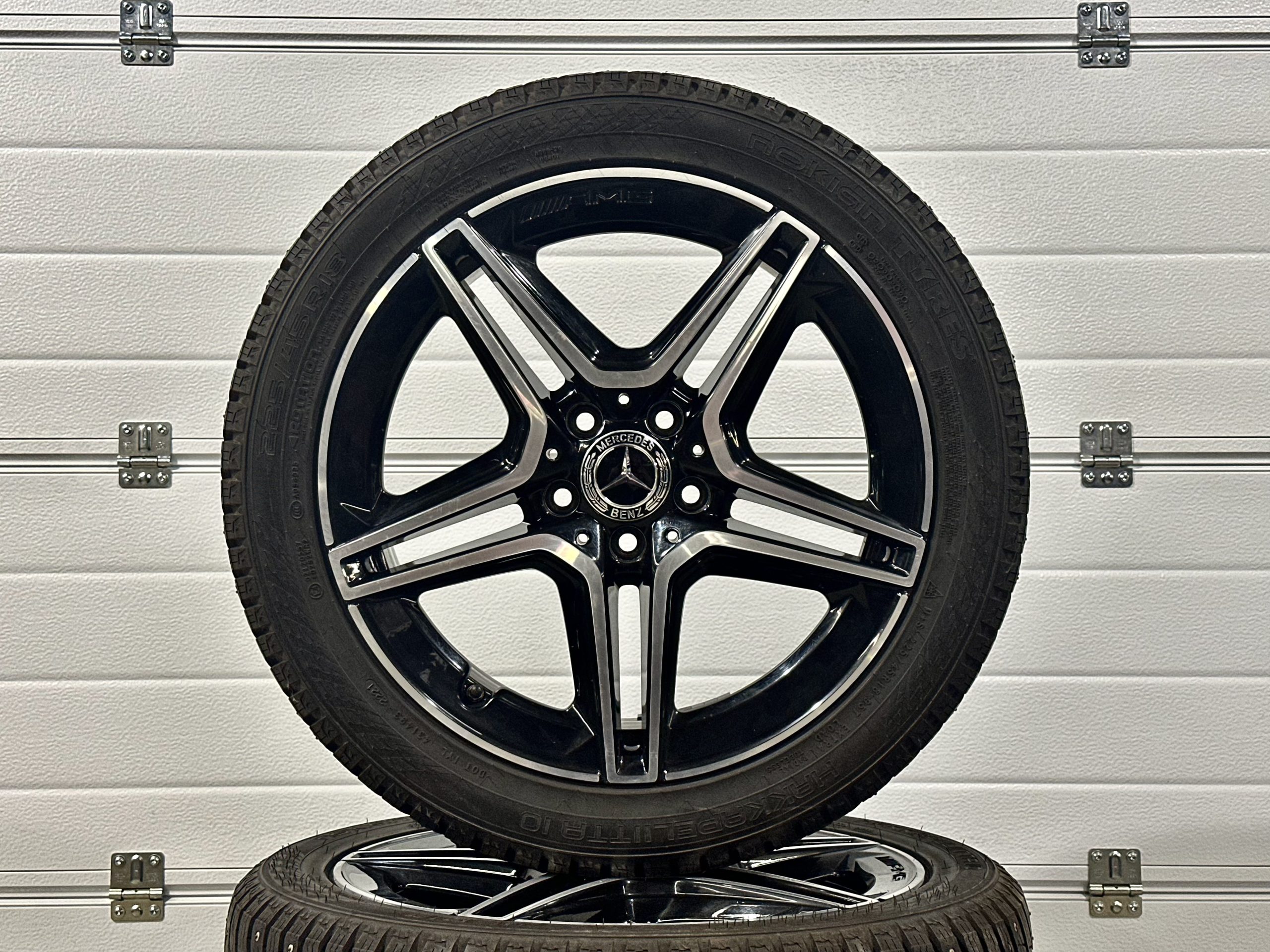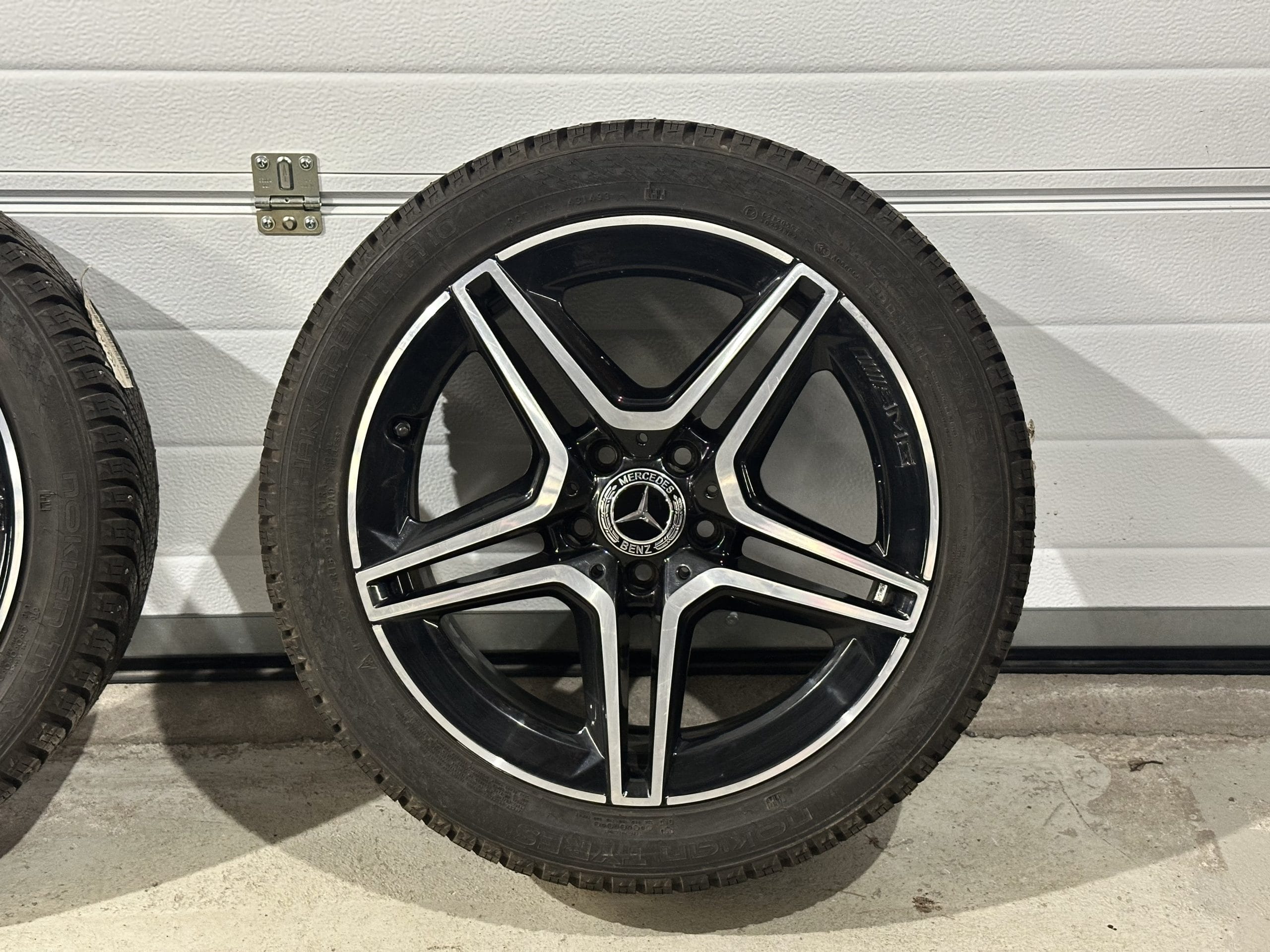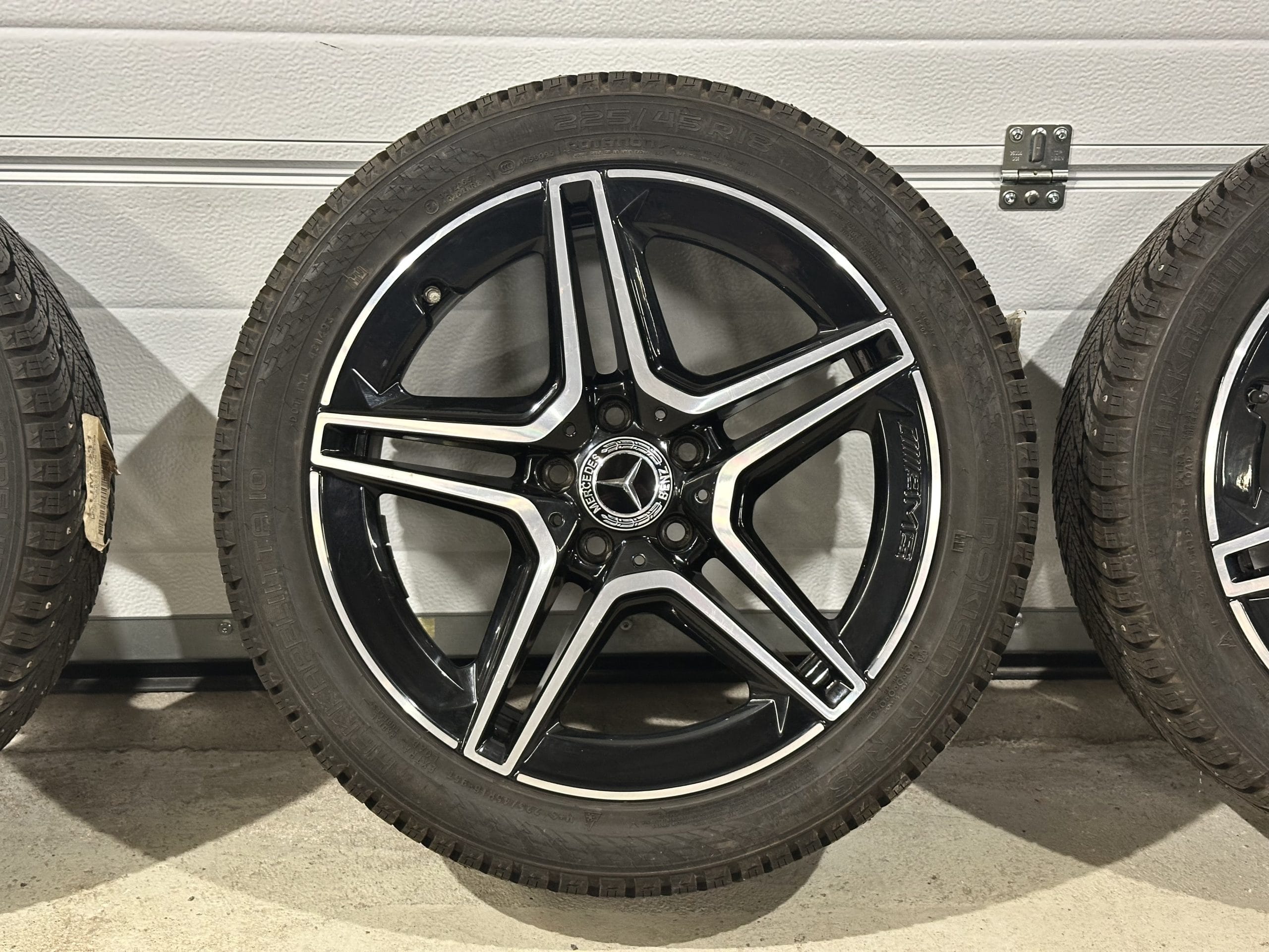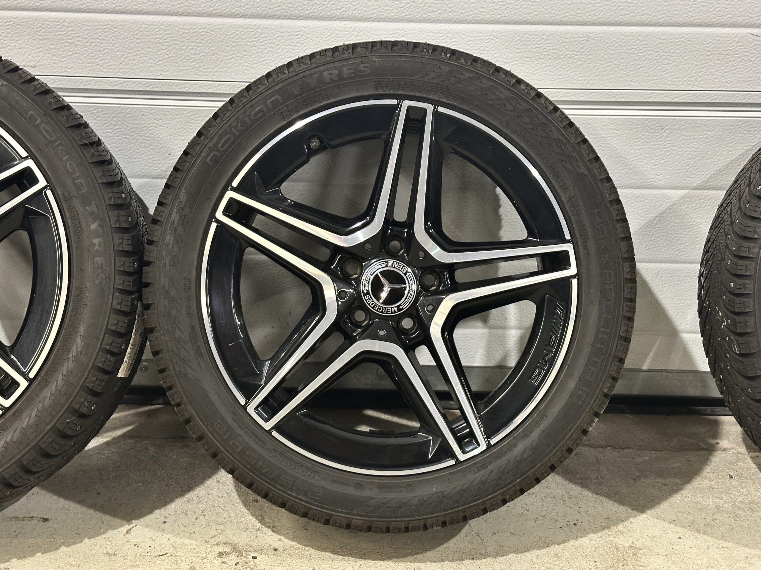 Alkuperäiset Mercedes 18″ AMG alumiinivanteet. Renkaina uutta vastaavat Nokian 225/45-18 nastarenkaat, joissa pintaa n. 9,0; 9,0; 9,1 ja 9,1mm.