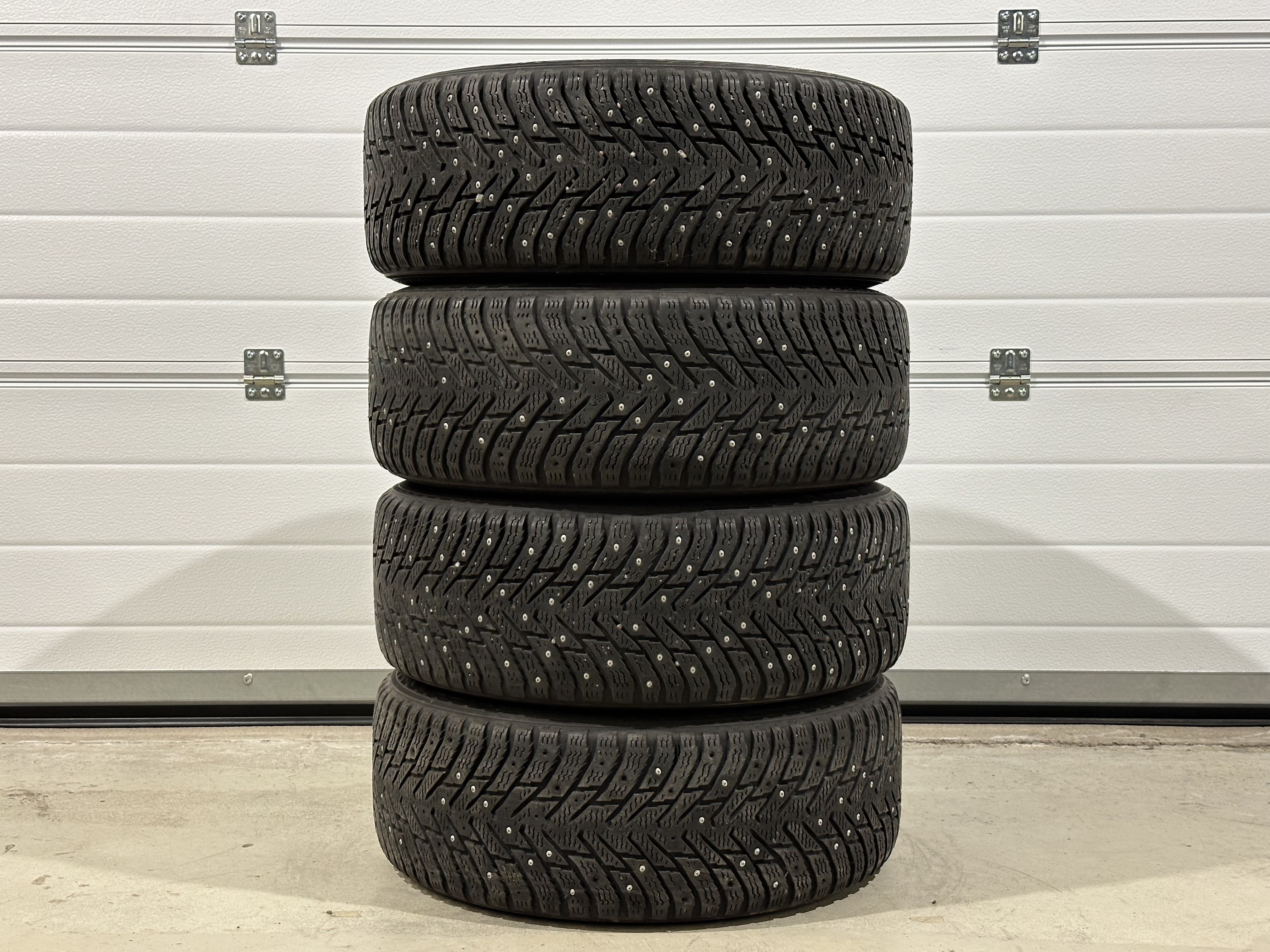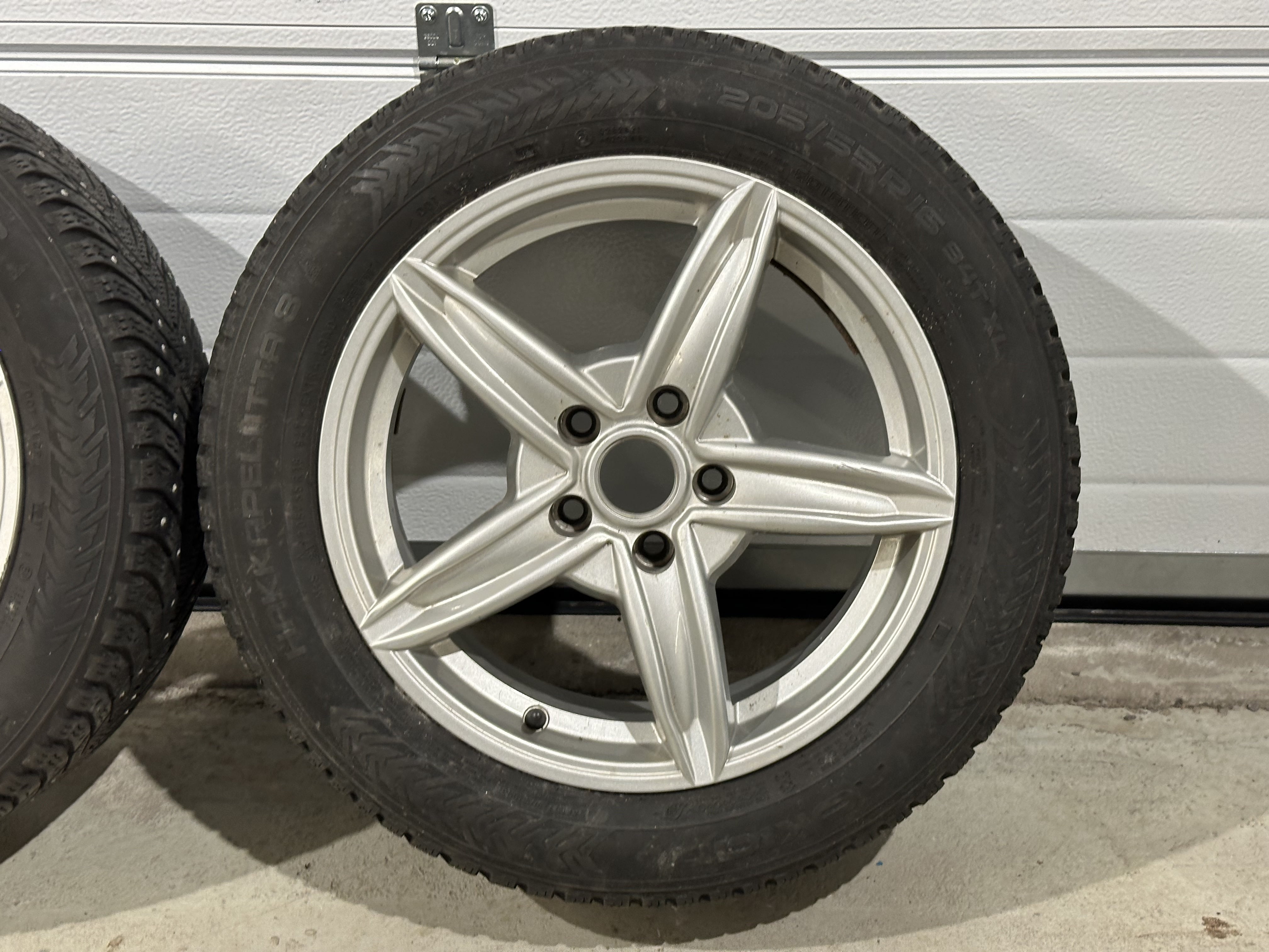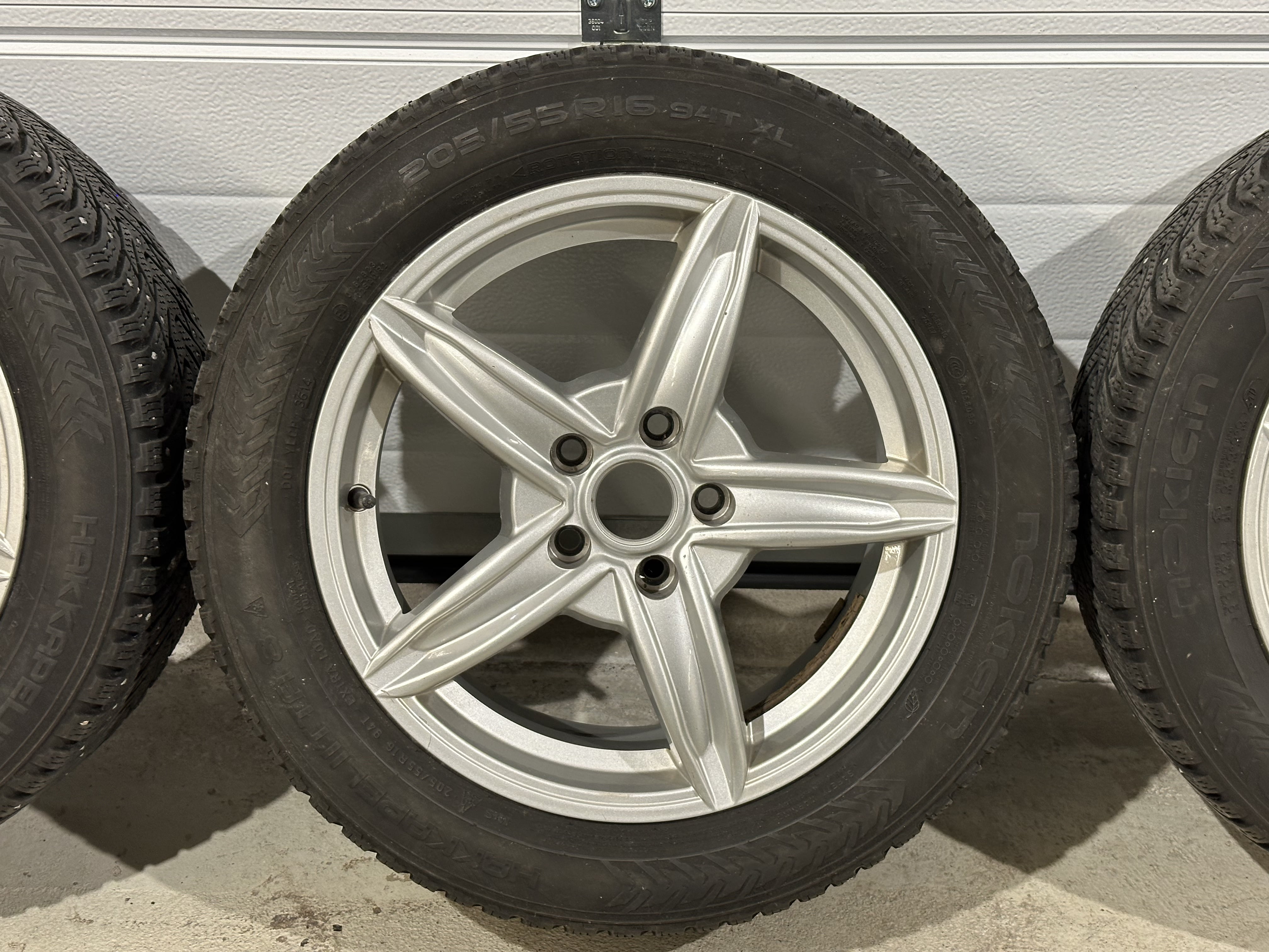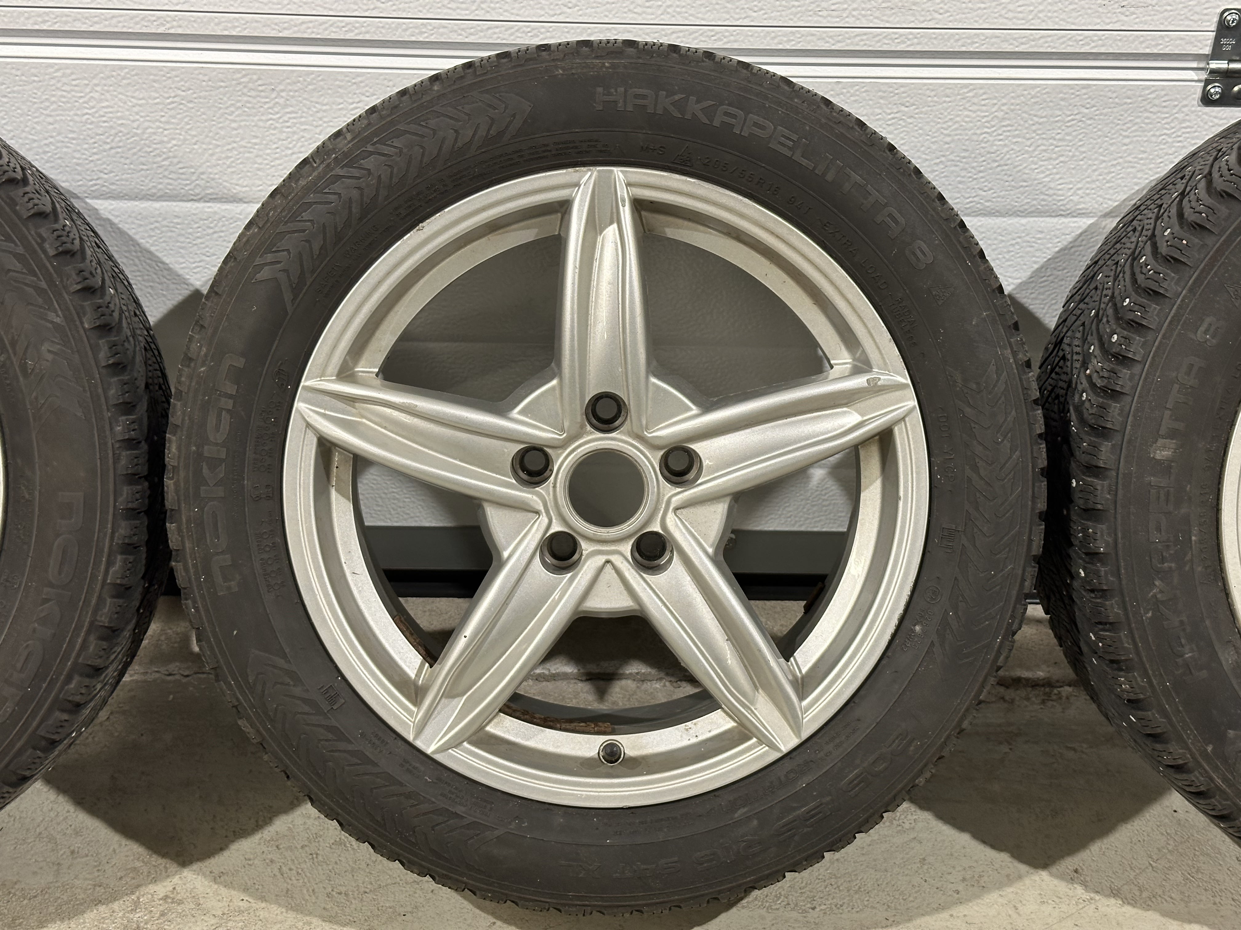Alumiinivanteet nastarenkailla Volvo S60 ja V60 henkilöautoihin. Renkaina Nokian 205/55-16 (94 XL) nastarenkaat, joissa pintaa n. 5,1; 5,4; 6,7 ja 7,2mm.
